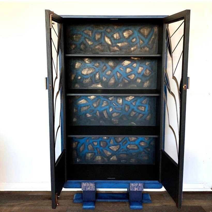 Please see photos, which include a before photo so you can see the transformation. Inspiration for the whole piece was actually the little carved oranges details that were already on the doors. Because who is hugely attracted to fruit? Those beautiful butterflies, that’s who! So the design on the glass is a stylised representation of a ‘Common Blue’ butterfly. I kept the lines uncomplicated, in-keeping with the design of the piece, and the era it was originally created in.